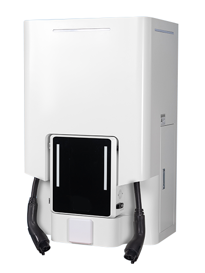 L2 AC fast charger system. Up to 19.2 kW max power dynamically allocated between the two J1772 ports.